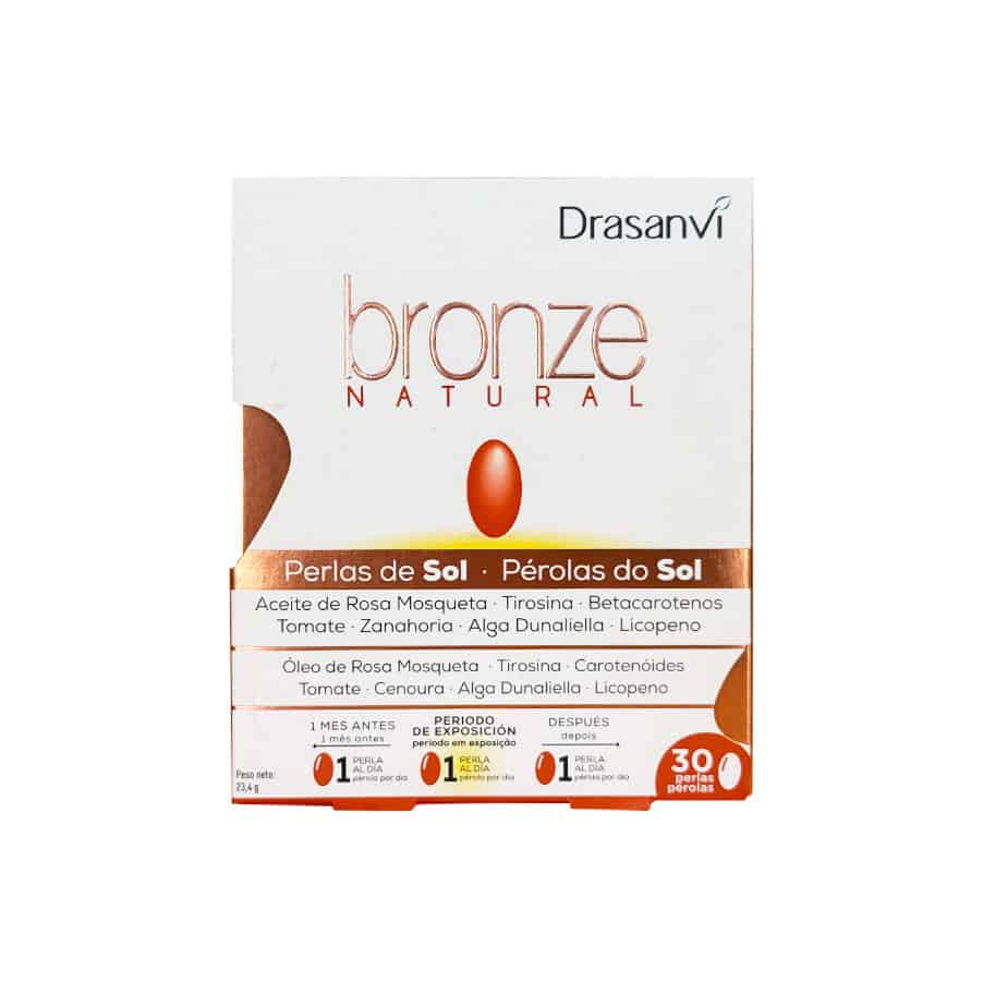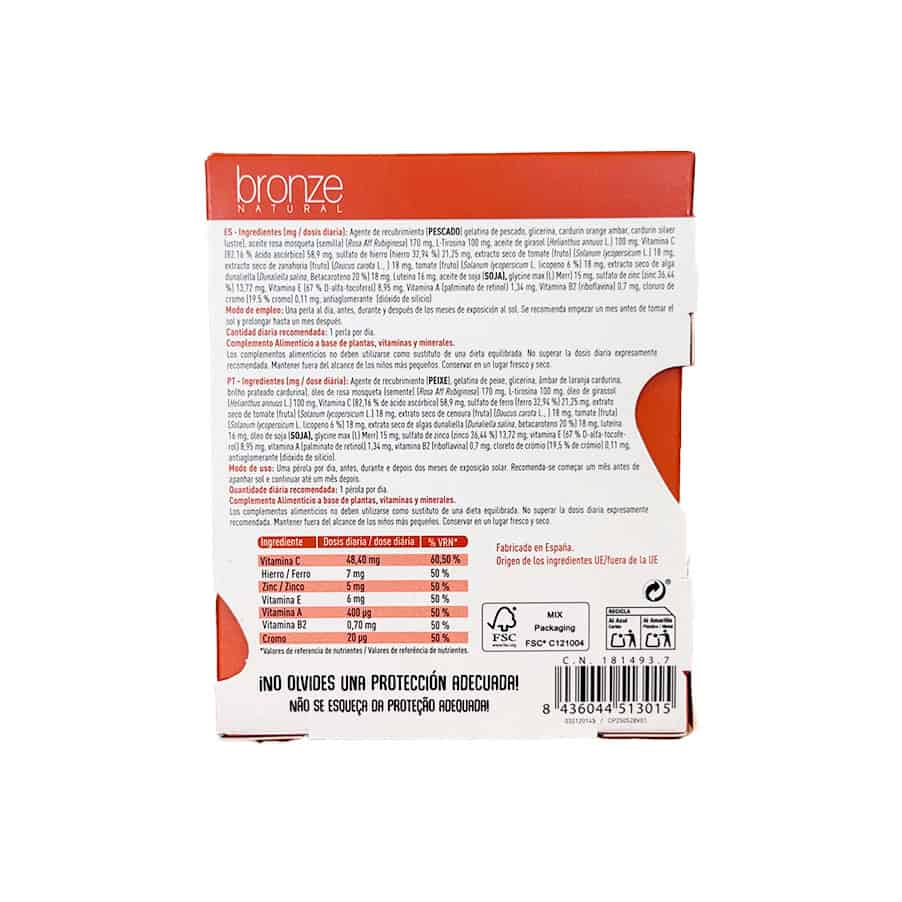 Bronze Natural é um suplemento alimentar à base de óleo de Rosa Mosqueta, rico em ácidos gordos essenciais, extrato seco de Tomate, Cenoura e Alga Dunaliella e extratos ricos em pigmentos como o Licopeno, Betacarotenos e Luteína. Ainda incorpora uma fonte de Vitaminas (A, E, C e B2), destacando a Vitamina E que contribui para a proteção das células combatendo o dano oxidativo. Pela sua importância, mencionamos a presença do aminoácido L-tirosina, precursor da Melanina (pigmento responsável da cor da pele).