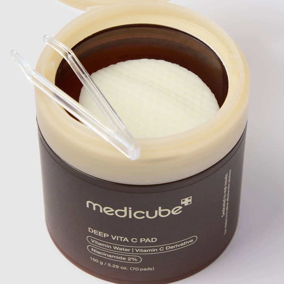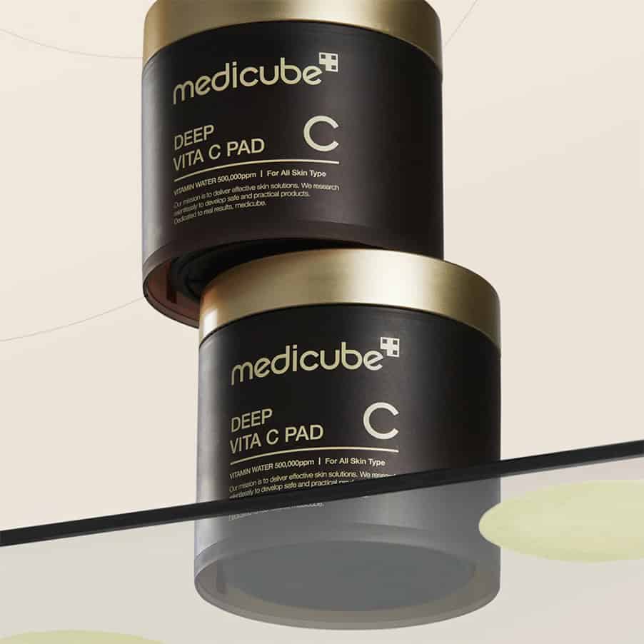 Deep Vita C Pads da Medicube são discos tonificantes de dupla face, concebidas para iluminar, uniformizar o tom de pele e refinar a textura.