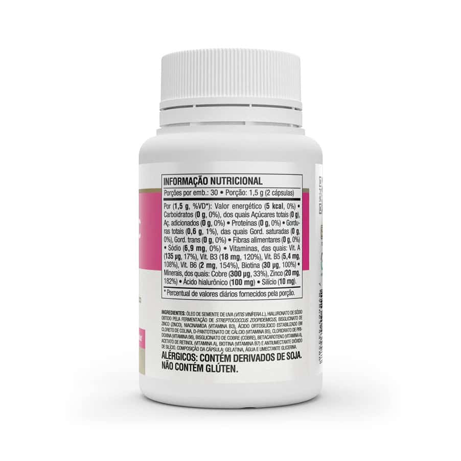 Óleo de semente de uva (Vitis vinifera L.), hialuronato de sódio (obtido pela fermentação de Streptococcus zoopidemicus), bisglicinato de zinco (zinco), niacinamida (vitamina B3), ácido ortosilícico estabilizado em cloreto de colina, d-pantotenato de cálcio (vitamina B5), cloridrato de piridoxina (vitamina B6), bisglicinato de cobre (cobre), betacaroteno (vitamina A), acetato de retinol (vitamina A), biotina (vitamina B7), antiumectante dióxido de silício. Cápsula: gelatina, água, umectante glicerina.