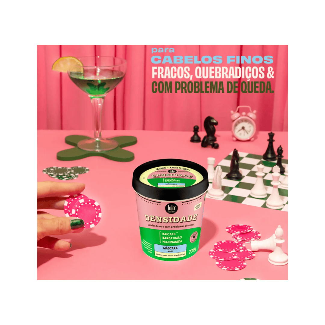A Máscara Densidade da Lola Cosmetics foi cuidadosamente criada para transformar cabelos finos, frágeis ou com pouca densidade em fios mais fortes, encorpados e cheios de vitalidade. Graças à sua fórmula inovadora à base de ingredientes vegetais e óleos nutritivos, esta máscara atua de forma progressiva, restaurando a fibra capilar e devolvendo a elasticidade e o brilho natural.