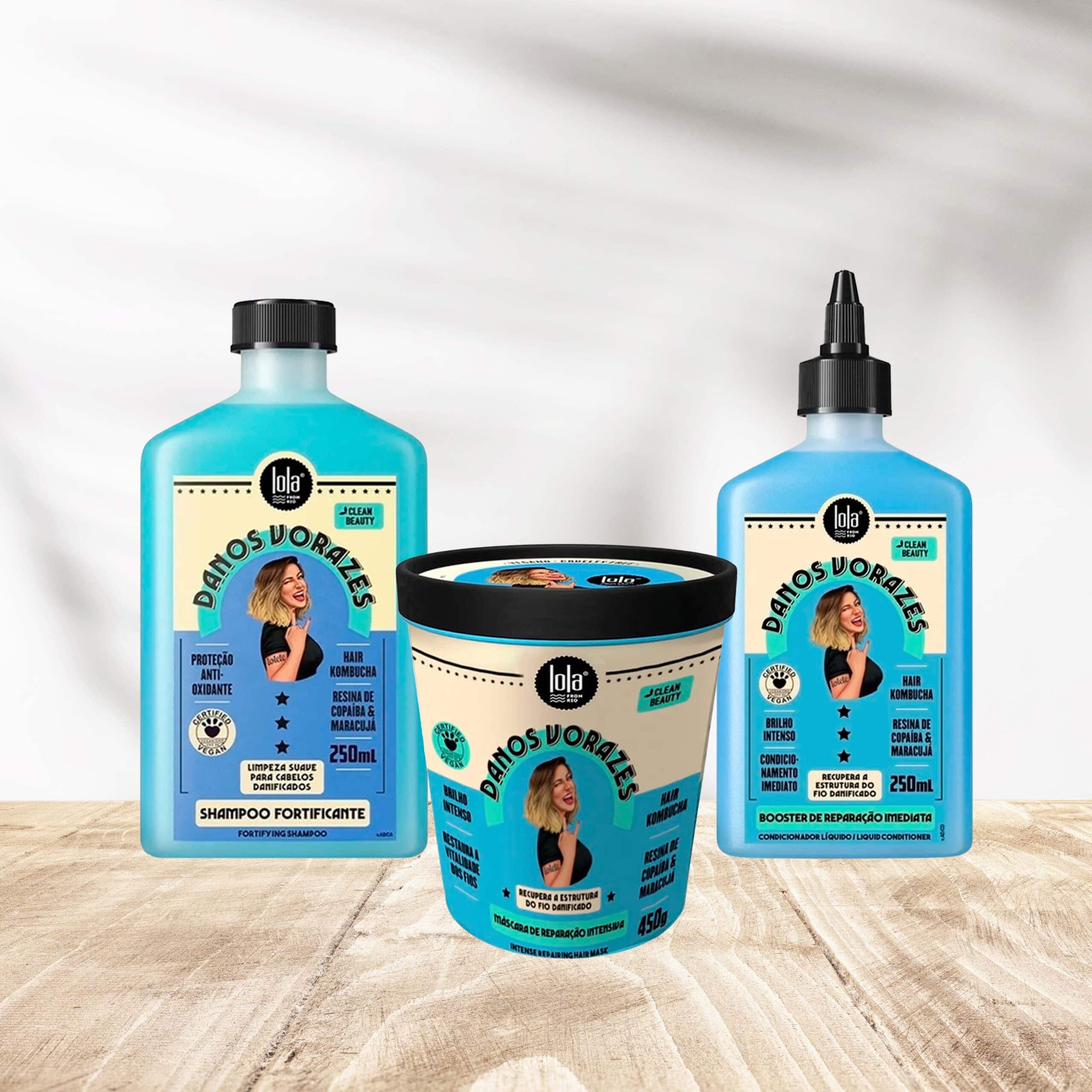 O Pack Lola Danos Vorazes foi desenvolvido para cuidar em profundidade dos cabelos danificados, frágeis e sem vida. Este conjunto reúne três produtos essenciais que atuam em sinergia: o Shampoo Fortificante, a Máscara de Reparação Intensiva e o Booster de Reparação Imediata. Juntos, oferecem uma rotina completa que fortalece, nutre e devolve elasticidade ao fio.