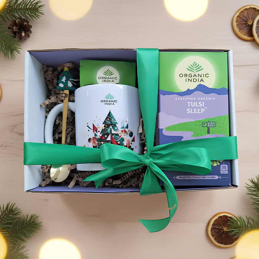 O Ritual de Natal Tulsi Sleep inclui a infusão biológica Tulsi Sleep Organic India, selecionada pela sua pureza e origem sustentável. Além disso, o conjunto integra uma caneca exclusiva com design natalício e uma colher decorativa com motivo de Natal. Assim, cada detalhe contribui para uma experiência de preparação do chá mais confortável e acolhedora.