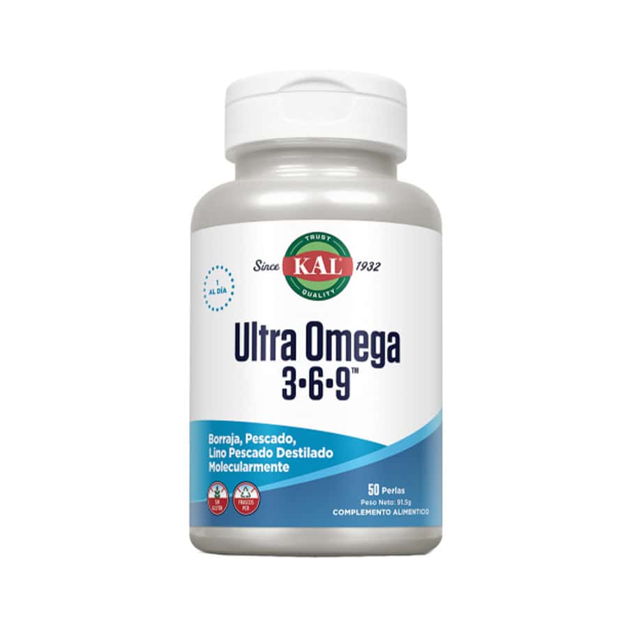 O Ultra Ómega 3-6-9 50 Cápsulas Kal é um suplemento alimentar completo que combina três fontes naturais de ácidos gordos essenciais — óleo de peixe, óleo de borragem e óleo de linhaça — para oferecer um equilíbrio ideal entre ómega-3, ómega-6 e ómega-9.